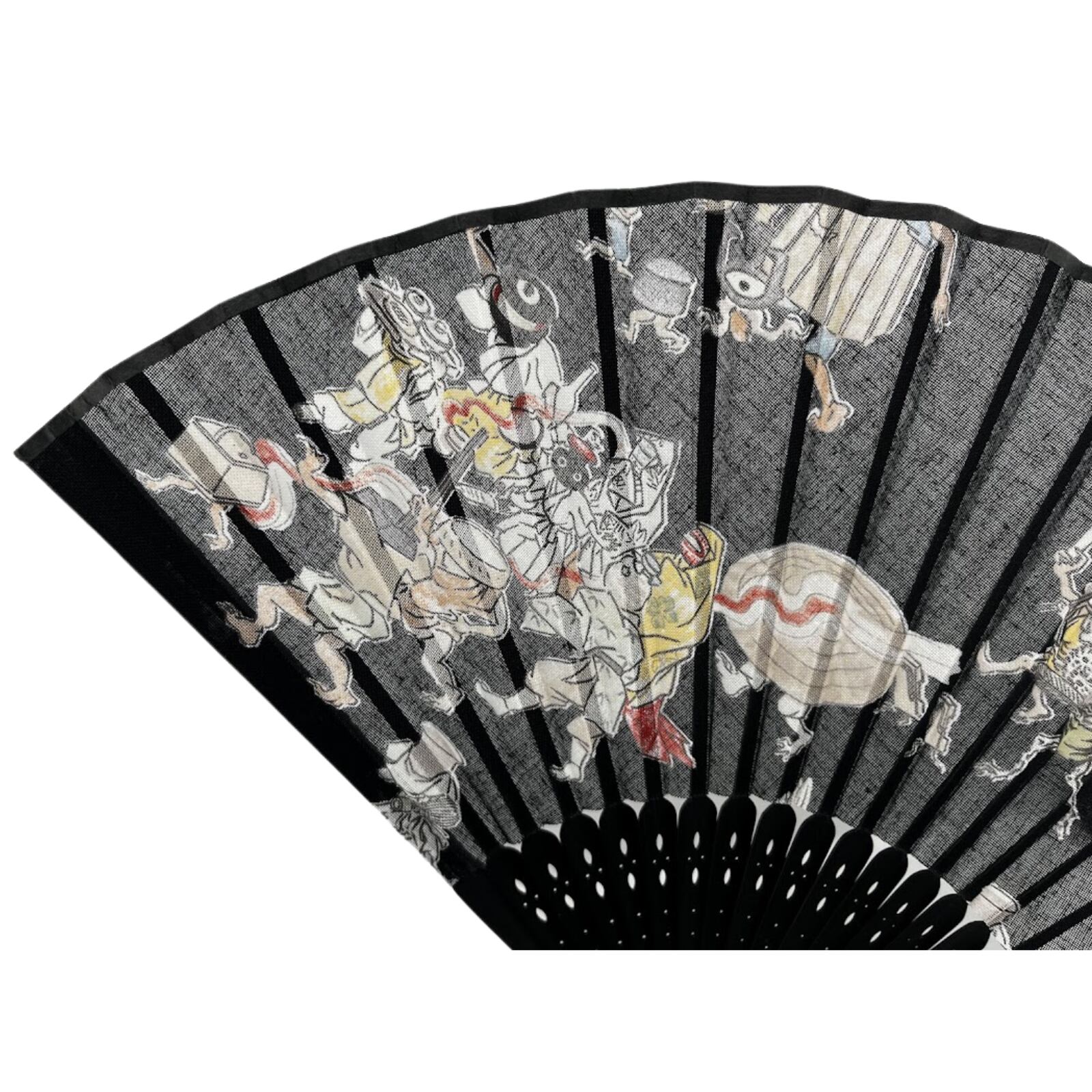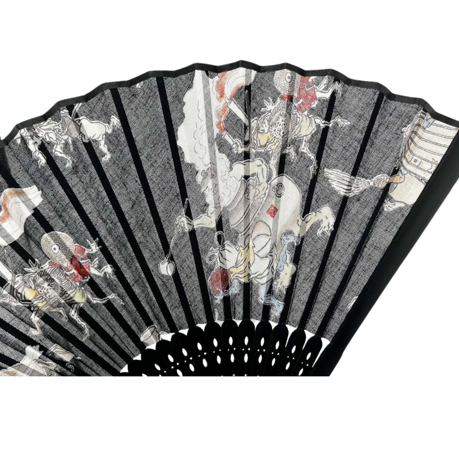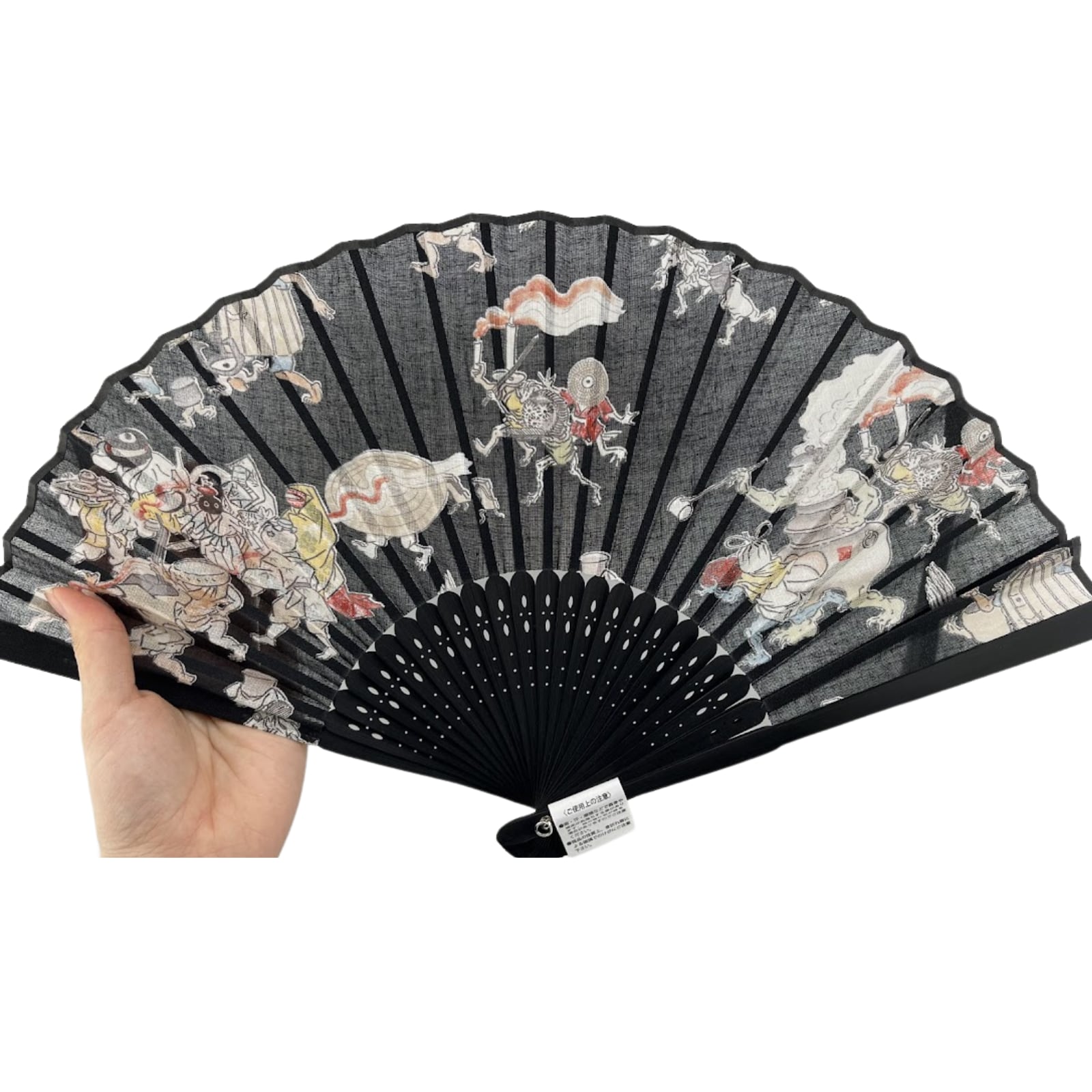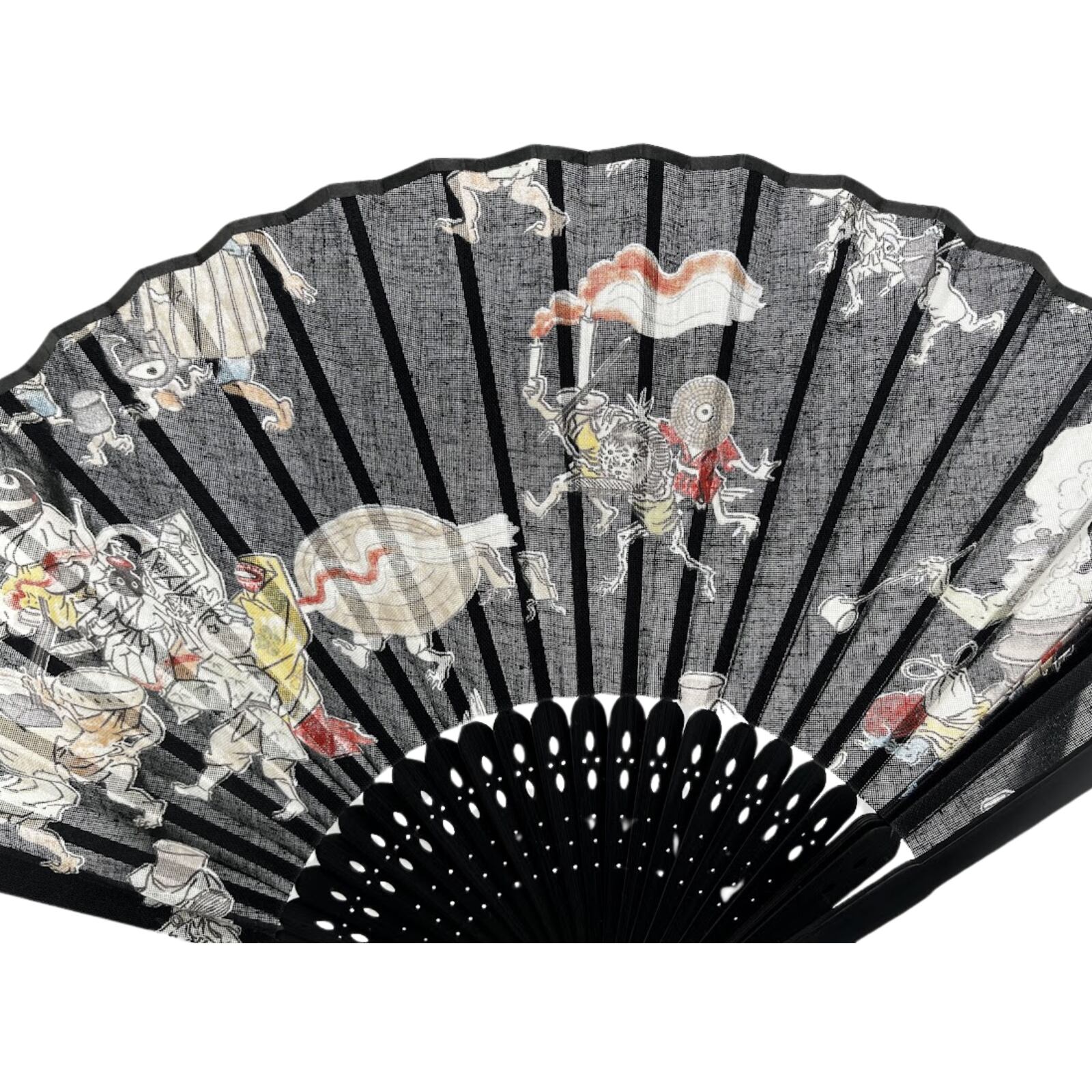 ハンカチ生地を貼り合せて制作した扇子。どこか愛くるしい日本の妖怪を描いた図案の扇子は、男女兼用で使っていただけます。