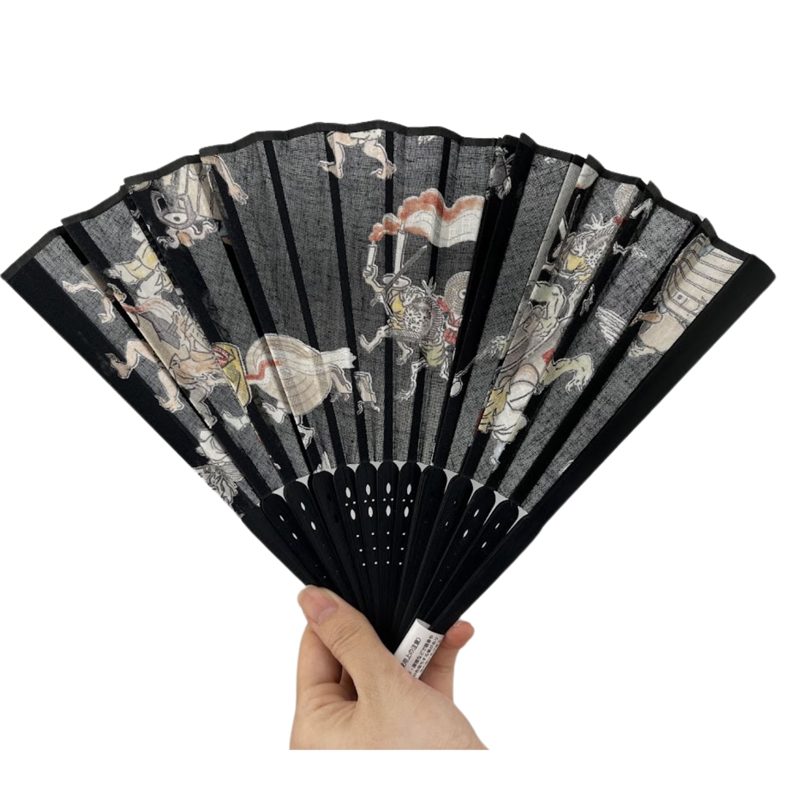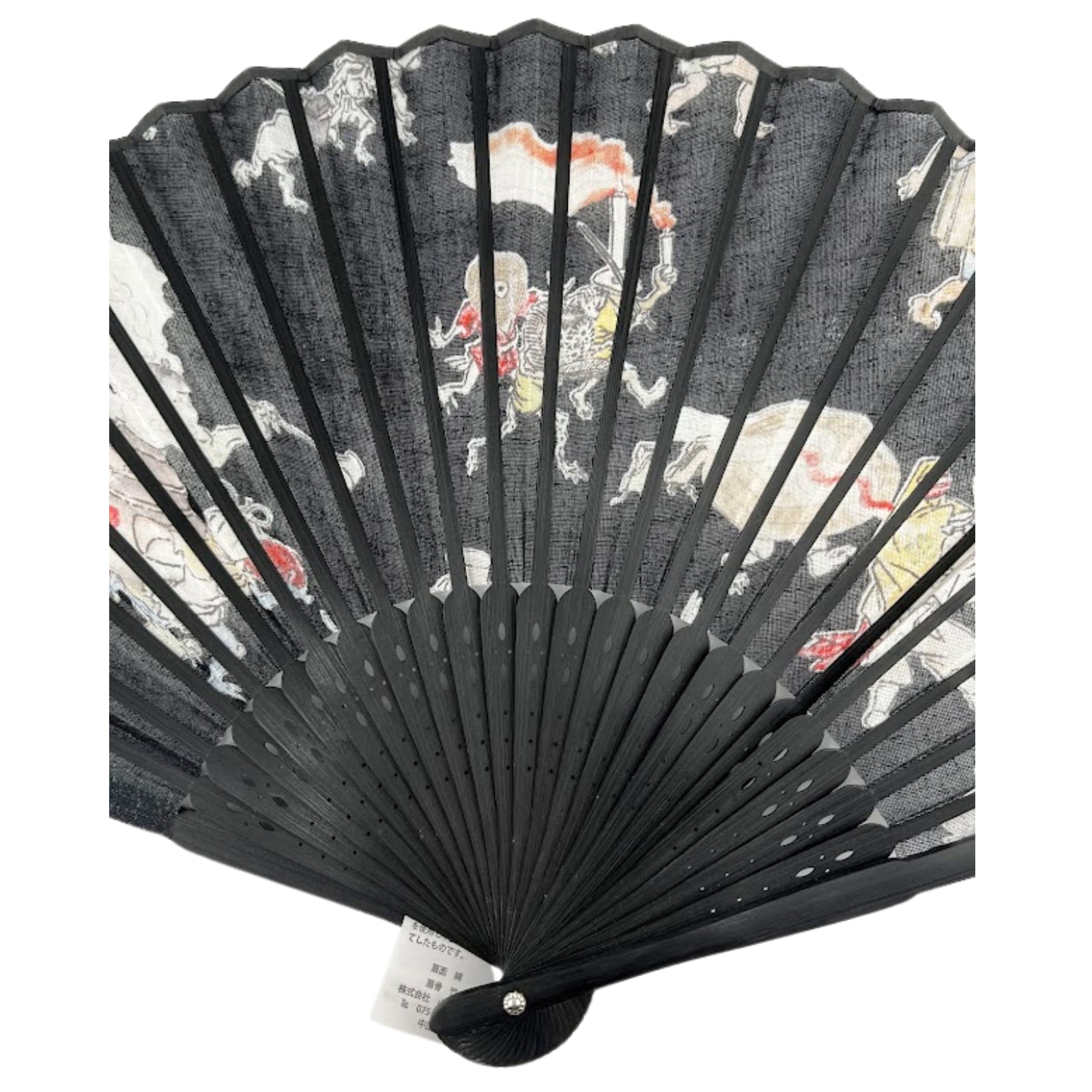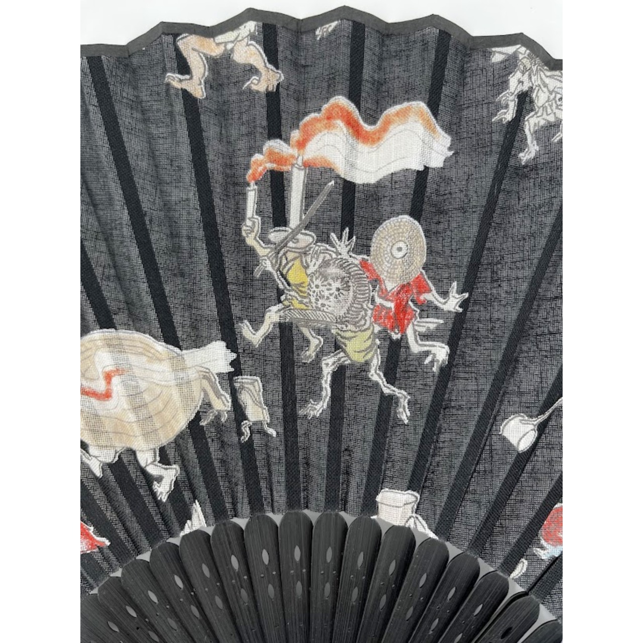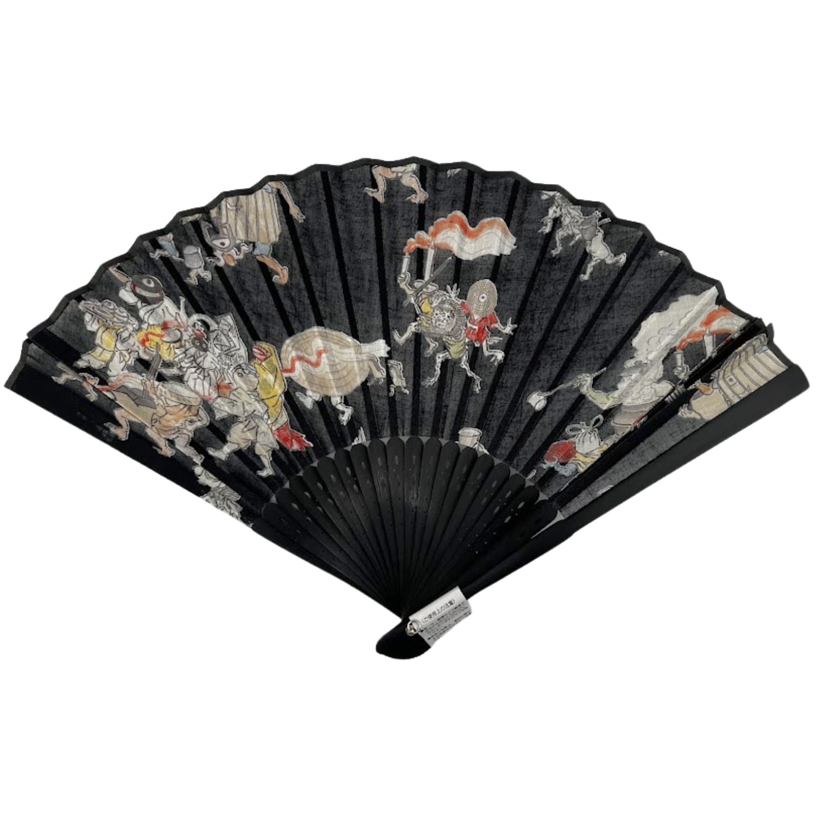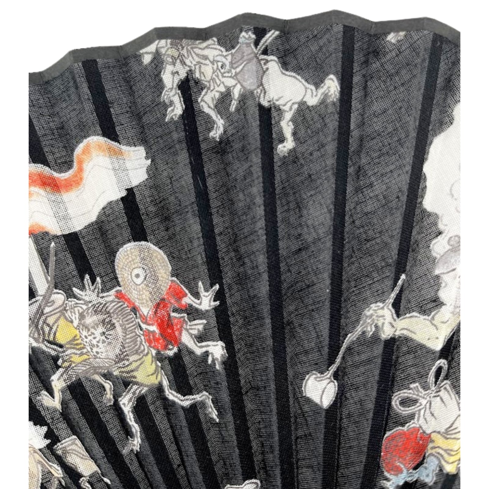 ハンカチ生地を貼り合せて制作した扇子。どこか愛くるしい日本の妖怪を描いた図案の扇子は、男女兼用で使っていただけます。